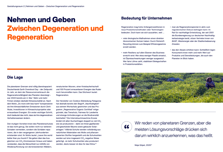 Mehr und mehr Firmen streben Klimaneutralität an. Sie kompensieren ihre klimaschädlichen Emissionen durch Zertifikate, Investitionen in Klimaschutzprojekte oder erneuerbare Energien. Den mutigen Vorreiter:innen des Planetenschutzes ist das nicht genug. Sie wollen nicht nur Schäden vermeiden, sondern die Schäden reparieren, die in den vergangenen Jahrhunderten entstanden sind. Ihr Stichwort lautet: Regeneration.